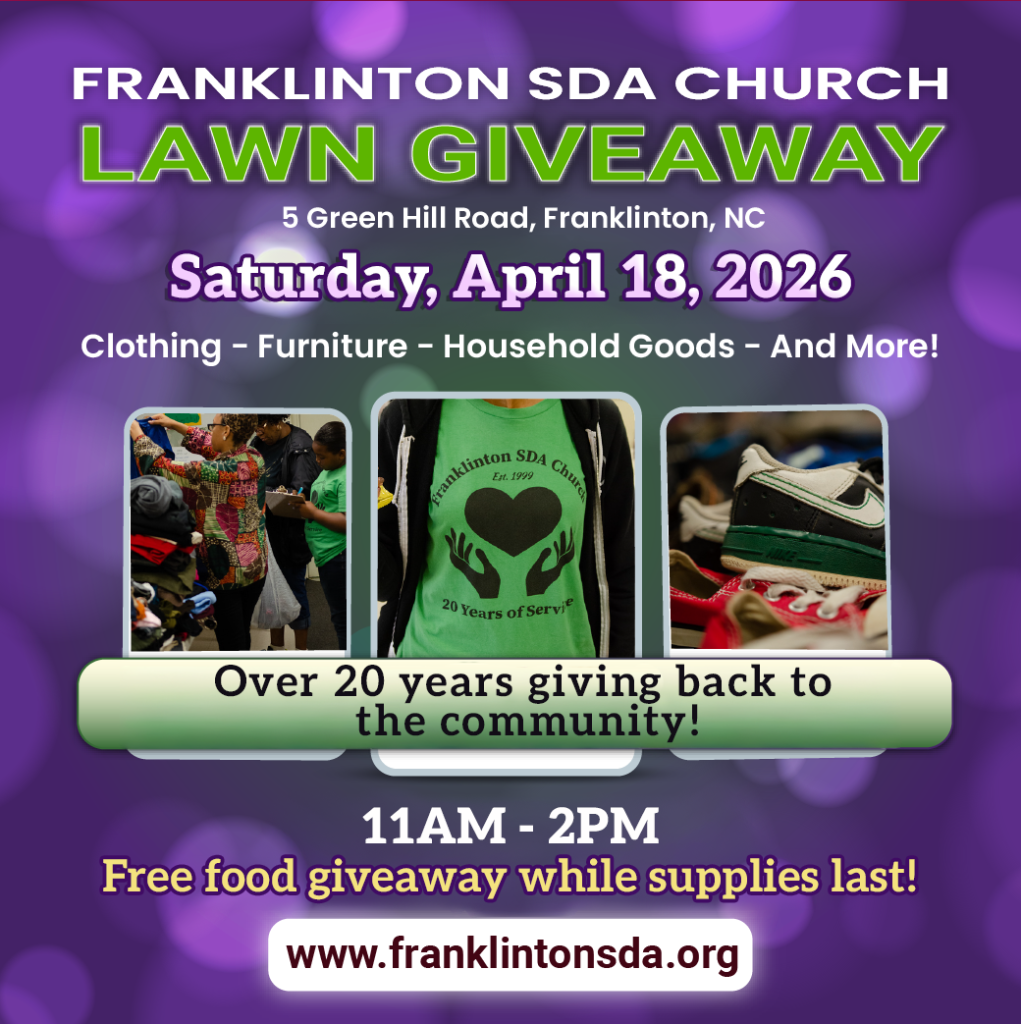 Don’t miss our absolutely free giveaway event – clothing, furniture, household goods, food and more! We will be on the lawn of the Franklinton SDA Church starting at 11AM. Saturday, April 18, 2026.